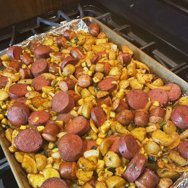 Roast until vegetables are tender and potatoes and sausage pieces are browned, tossing halfway through the roasting process, 20 to 25 minutes. Serve immediately.