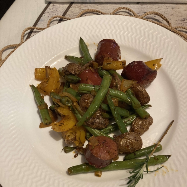 Mix remaining olive oil, salt, pepper, onion flakes, paprika, parsley, and oregano in the same bowl. Add sausage, green beans, bell pepper, and onion; mix until well combined. Add to the baking sheet; spread in a flat layer.
