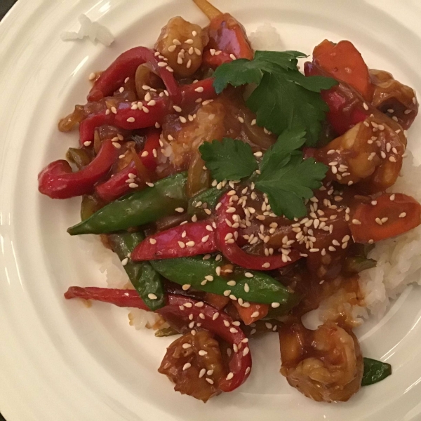 Serve shrimp and vegetables over hot rice, sprinkled with sesame seeds.