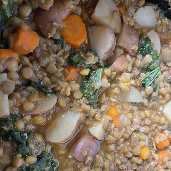 This flavorful lentil stew with potatoes, carrots, spinach, cumin, and coriander is made in a slow cooker for a no-fuss Mediterranean-inspired dish.