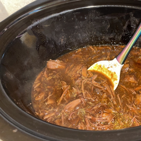 Remove the roast from the slow cooker, and shred the meat using two forks. Return the shredded pork to the slow cooker, and stir the meat into the juices.