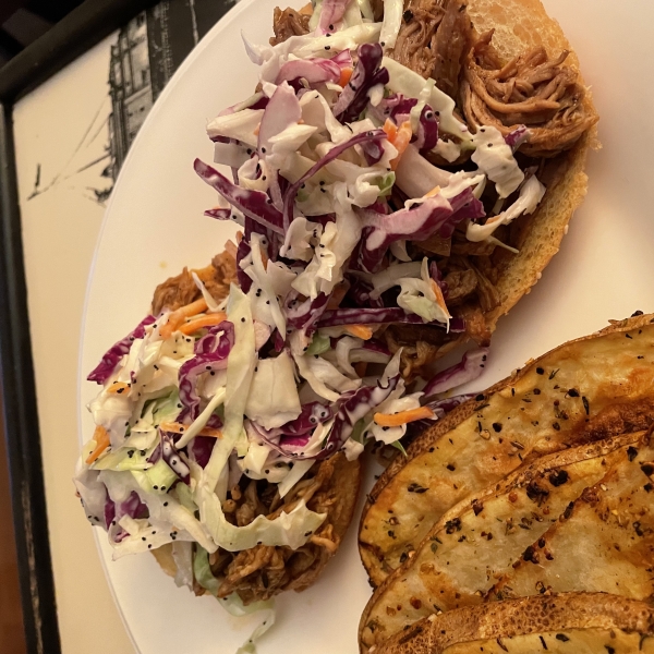 Texas-style pulled pork simmers in a tangy chili-seasoned barbecue sauce with plenty of onion, then pulled into tender shreds to serve on a buttered, toasted bun.