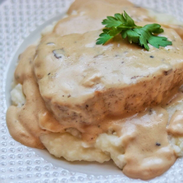 Boneless pork chops are baked smothered in a tasty sauce of sour cream, canned mushroom soup, and garlic, and the extra sauce doubles as a gravy for mashed potatoes!