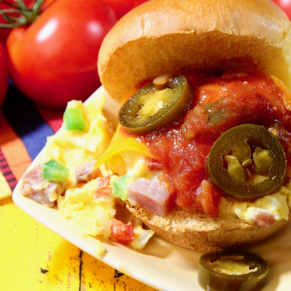 These sliders are a modified version of a Western omelet turned into a breakfast sandwich. Tasty served with hot sauce, avocado slices, sour cream, guacamole, and chopped cilantro.