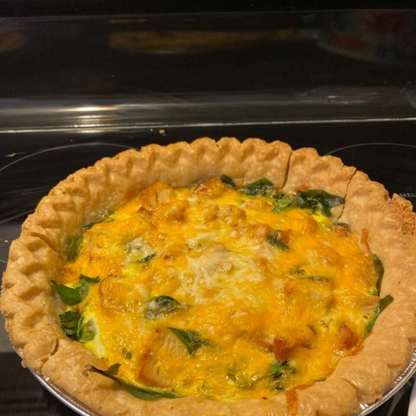 This chicken quiche recipe uses store-bought pie crust, fresh spinach, sweet onion, eggs, half-and-half, and mayonnaise for a beautiful brunch dish.