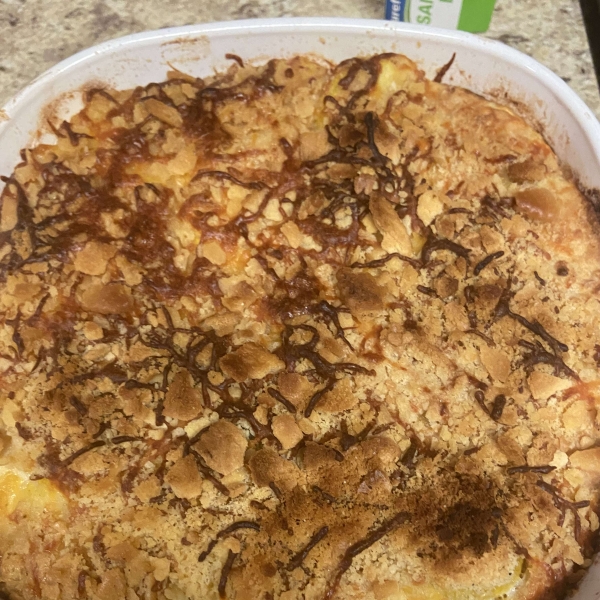 Mix cracker crumbs and cheese together in a medium bowl. Stir half of the cracker mixture into the cooked squash and onions.