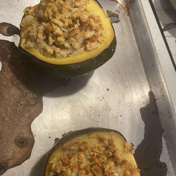 Acorn squash halves are filled with butter, brown sugar, stuffing mix, chicken broth and savory spices, and baked. Sprinkle with Parmesan cheese, if desired.
