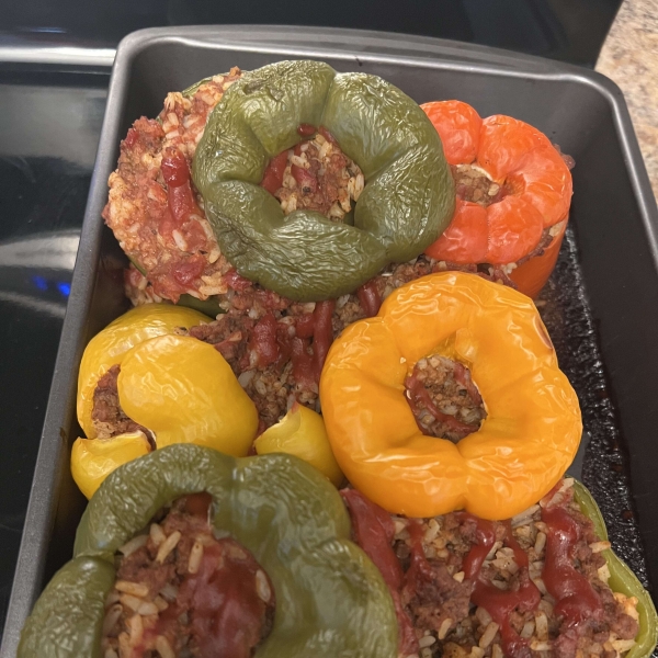 Stuffed peppers with a hearty ground beef and rice filling are topped with an Italian-seasoned tomato sauce in this easy entrée for six.
