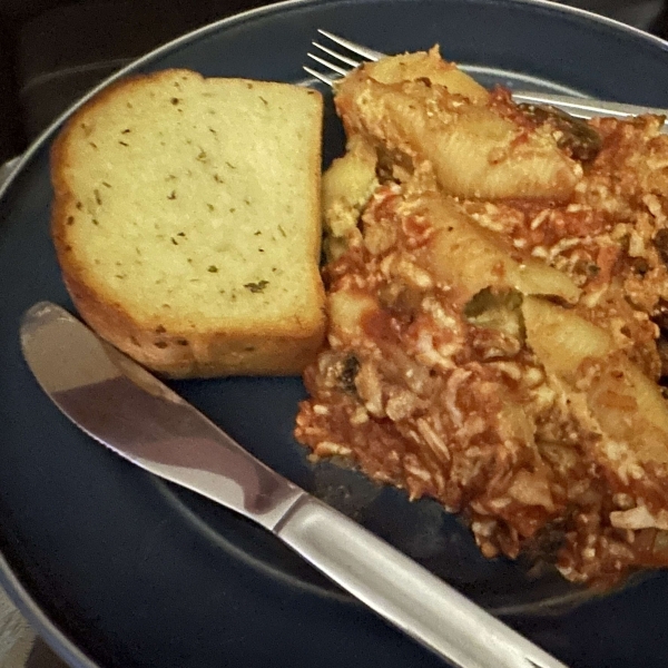 Stuff shells with ricotta mixture and place in a 9x13-inch baking dish. Pour pasta sauce mixture over the shells.