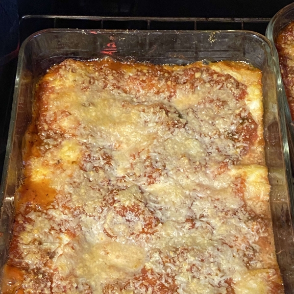 While the pasta is cooking, mix ricotta cheese, 1/2 of the mozzarella cheese, 1/2 of the Parmesan cheese, eggs, parsley, salt, and pepper in a large bowl until well combined.