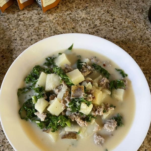 Zuppa Toscana made with sausage, potatoes, cream, spinach, and red pepper flakes. Tastes just like the one at your local Italian chain restaurant.