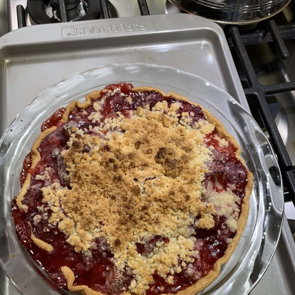 Pour berries into prepared pie crust mounding them in the middle; mounding is necessary as the berries will sink as they bake. Cover berries with crumb topping and top crumbs with about 15 pea-sized blobs of butter. Wrap edges of pie crust with foil to prevent burning.