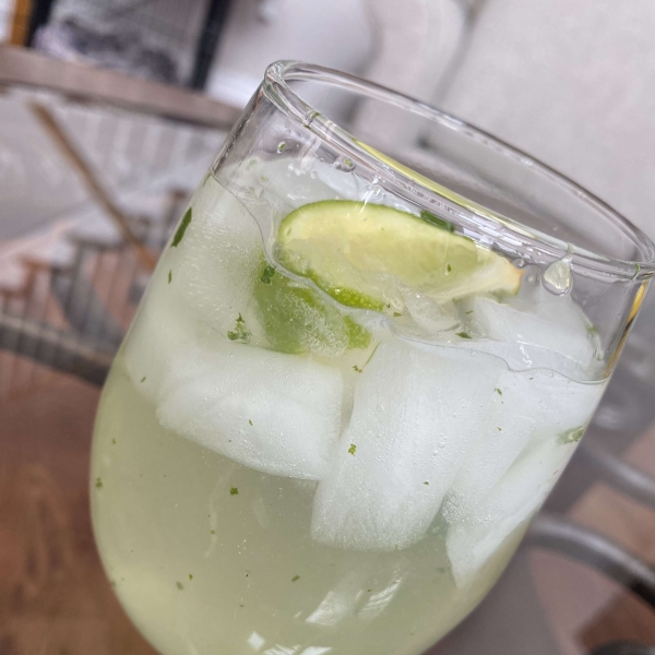 Place mint leaves and 1 lime wedge into a sturdy glass. Use a muddler and crush to release mint oils and lime juice.