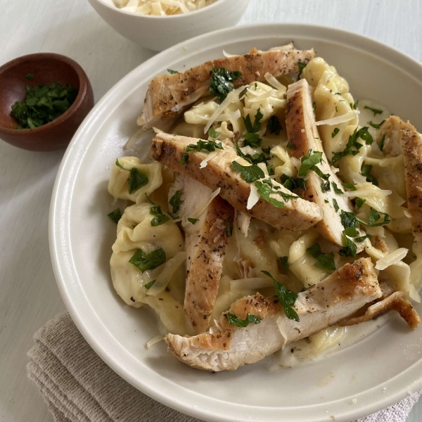 Tortellini Alfredo with grilled chicken in a creamy, homemade sauce is a weeknight dinner the family will love.