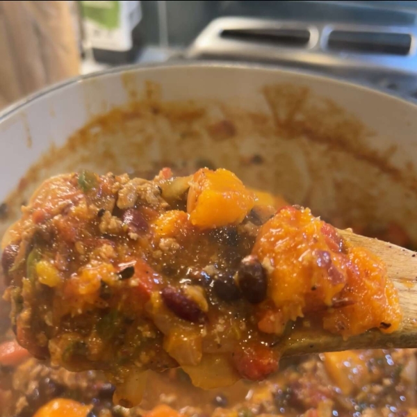 This spicy butternut squash chili with ground turkey, tomatoes, green chilies, hominy, and beans is a delicious and hearty dinner for fall.
