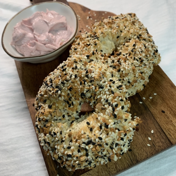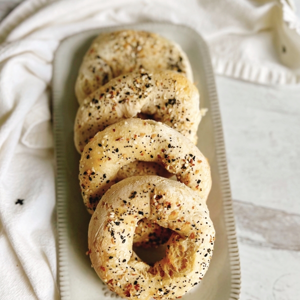 Transfer dough to a lightly floured work surface, and knead until smooth, 5 to 7 minutes. Divide the dough evenly into 4 balls, rolling and stretching each into 3/4-inch thick ropes that are about 8- to 9-inches long. Connect both ends, pinching and sealing to form a bagel. Brush with egg white, and sprinkle with bagel seasoning.