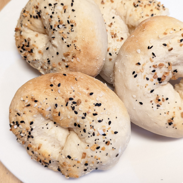 The base for these homemade bagels is a popular 2-ingredient pizza dough recipe. No yeast, no waiting for dough to rise, no boiling necessary. In and out of the air fryer in about 15 minutes. Optional toppings are everything bagel seasoning, poppy seeds, sesame seeds, or dried onion flakes.