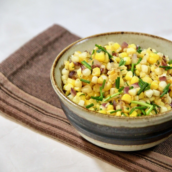 This warm corn salad with fresh corn, red onions, butter, parsley, and chives is a perfect accompaniment to your favorite steak, hot off the grill!