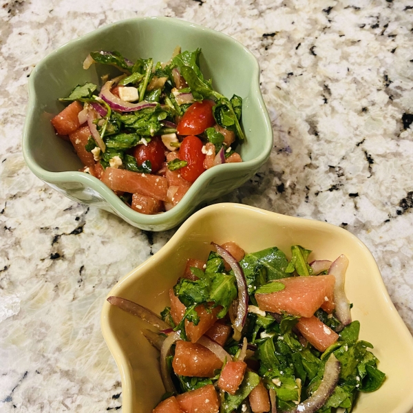 This watermelon feta salad with arugula and grape tomatoes is a refreshing summer salad with sweet, salty, peppery flavors in every bite.