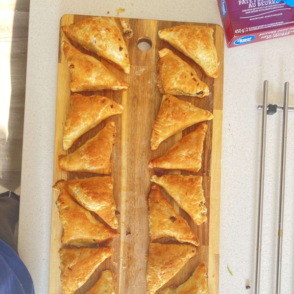 Unfold pastry sheet onto floured surface and lightly roll into a 12 x 15 inch square. Cut into eighteen 3 inch squares. Place a mounded teaspoon of mushroom filling in the center of each square. Fold pastry over filling to form a triangle. Pinch edges firmly together with a fork to seal.
